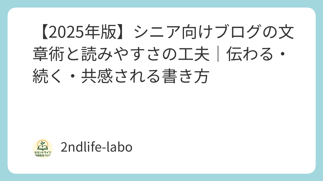 「何を書けばいいかわからない」「文章が長くなってしまう」「読みにくいと言われた」——そんな悩みを持つシニア世代に向けて、2025年最新版のブログ文章術と読みやすさの工夫を紹介します。伝わる・続く・共感されるための書き方のコツを、実例とともに解説します。
